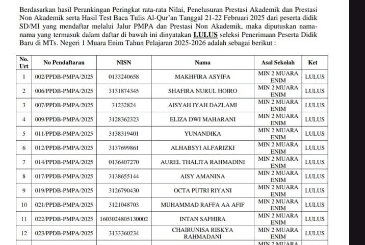 ”Alhamdulillah dari 30 siswa/siswi yang mendaftar semuanya lulus. Bagi siswa/siswi yang sudah dinyatakan lulus untuk segera daftar ulang langsung ke MTs Negeri 1 Muara Enim. Link Formulir pendaftaran bisa di download disini: